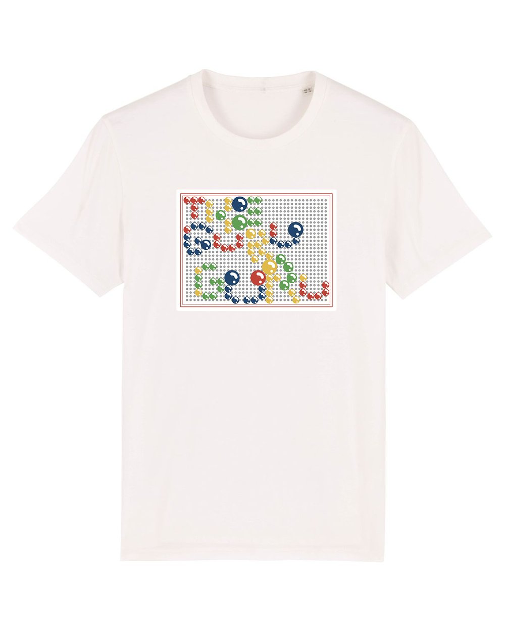 This is a white t-shirt with a mosaic toy print inspired by the 'Make (Less) Babies' artwork.
